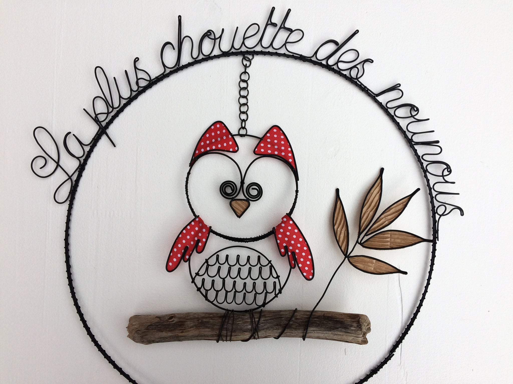 Chouette hibou en fil de fer recuit, cadeau nounou, bois flotté, déco nature, décoration maison, oiseau décoratif, cadeau phrase fil de fer