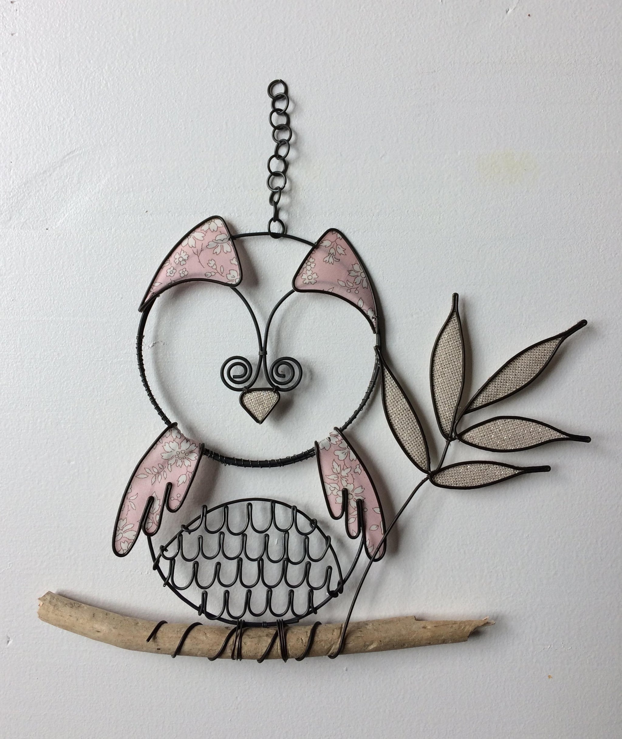 Chouette, hibou, oiseau en fil de fer recuit, décoration murale, oiseau métal avec tissu et carton, phrase fil de fer, déco murale bohème
