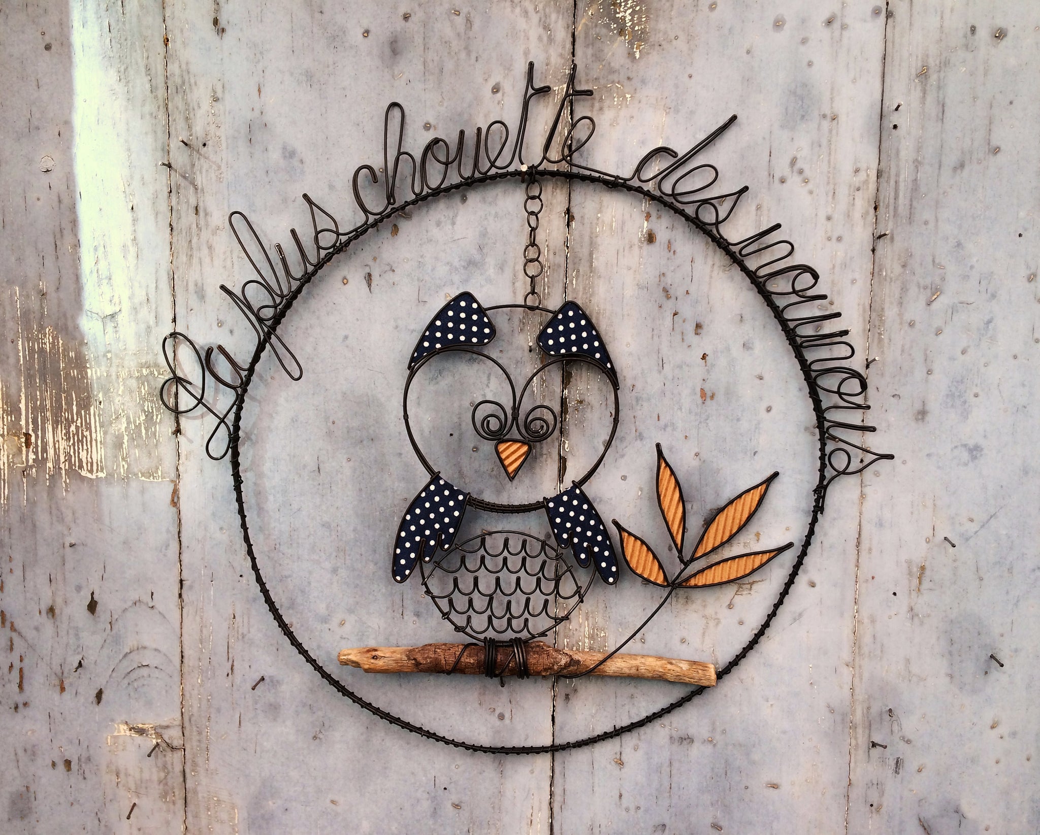 Chouette hibou en fil de fer recuit, cadeau nounou, bois flotté, déco nature, décoration maison, oiseau décoratif, cadeau phrase fil de fer