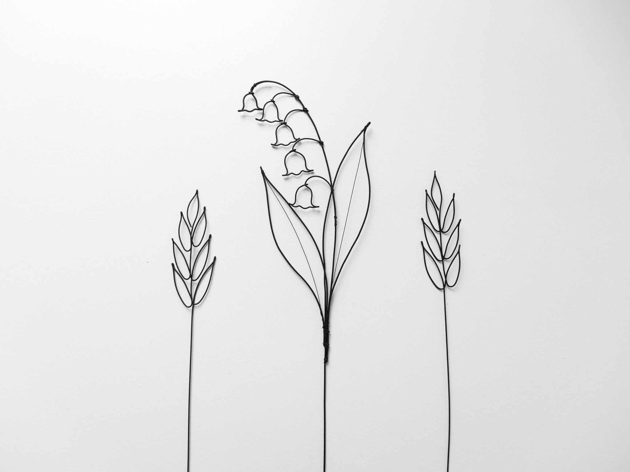 Bouquet de 3 fleurs éternelles en fil de fer recuit : Muguet et Brindilles, Déco florale moderne, décoration d'intérieur, cadeau