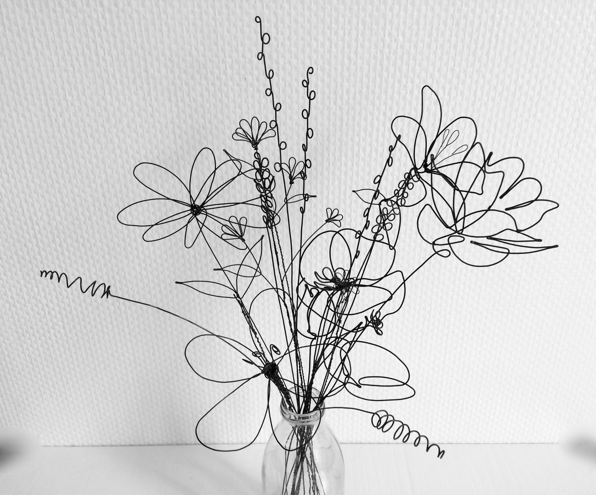 Bouquet de 4 fleurs en fil de fer recuit, fleurs vase floral, décoration florale, déco bohème nature, coquelicot, sculpture métal, cadeau