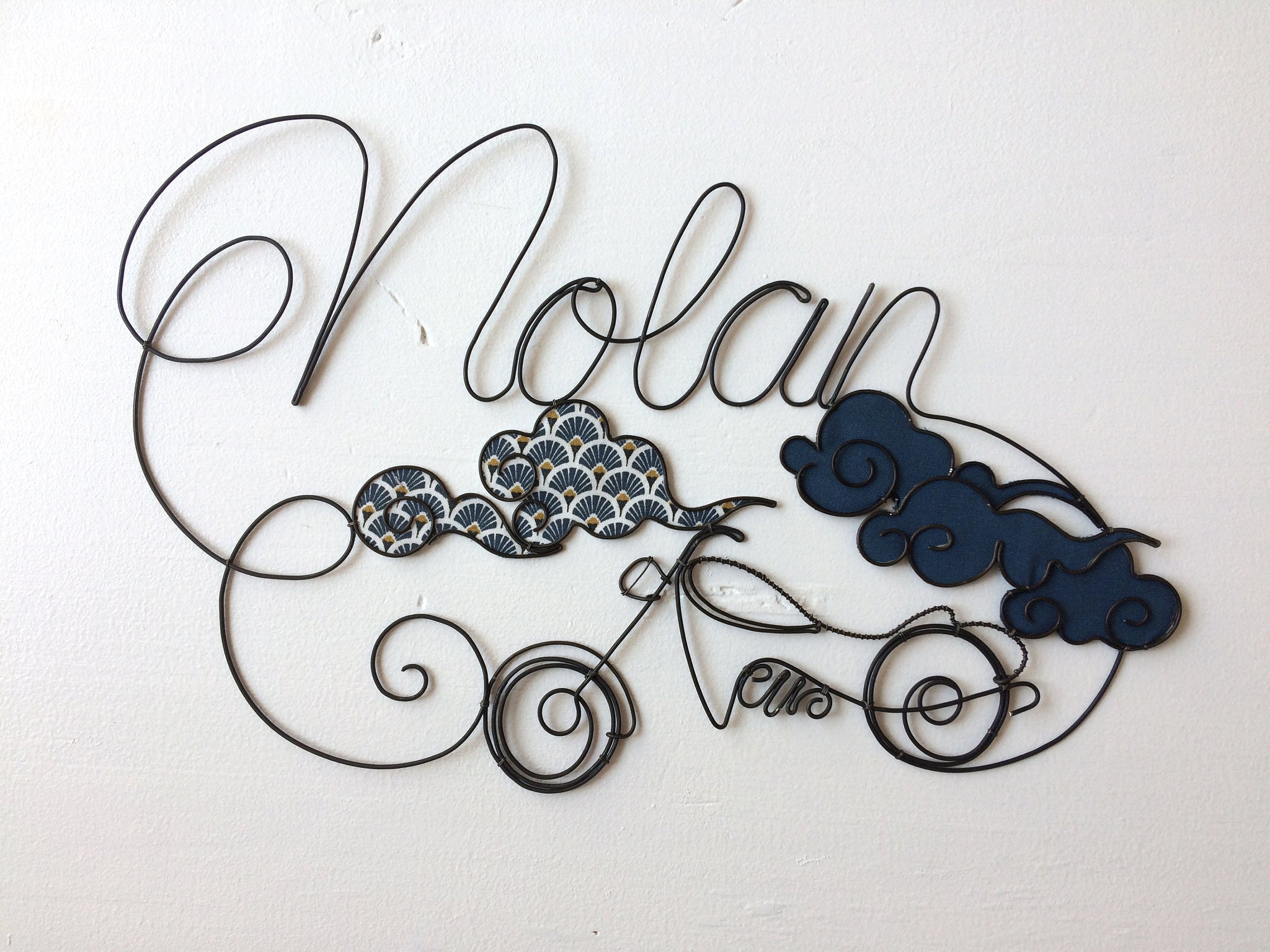 Prénom fil de fer personnalisable, Nolan, prénom avec moto et nuage, décoration chambre de bébé, cadeau de naissance, cadeau baptême