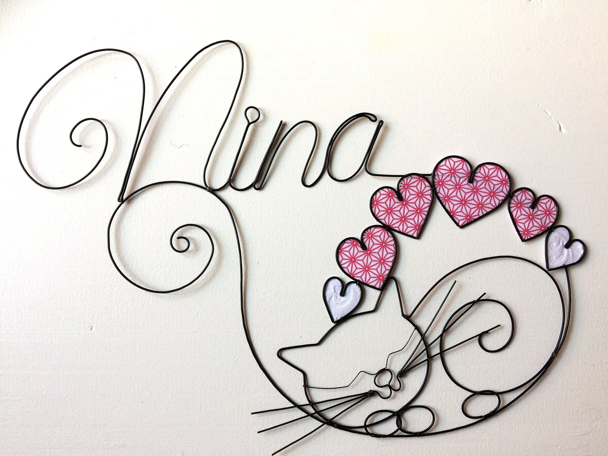 Prénom fil de fer personnalisable, prénom avec chat fil de fer recuit, décoration chambre d'enfant, cadeau de naissance, plaque porte métal