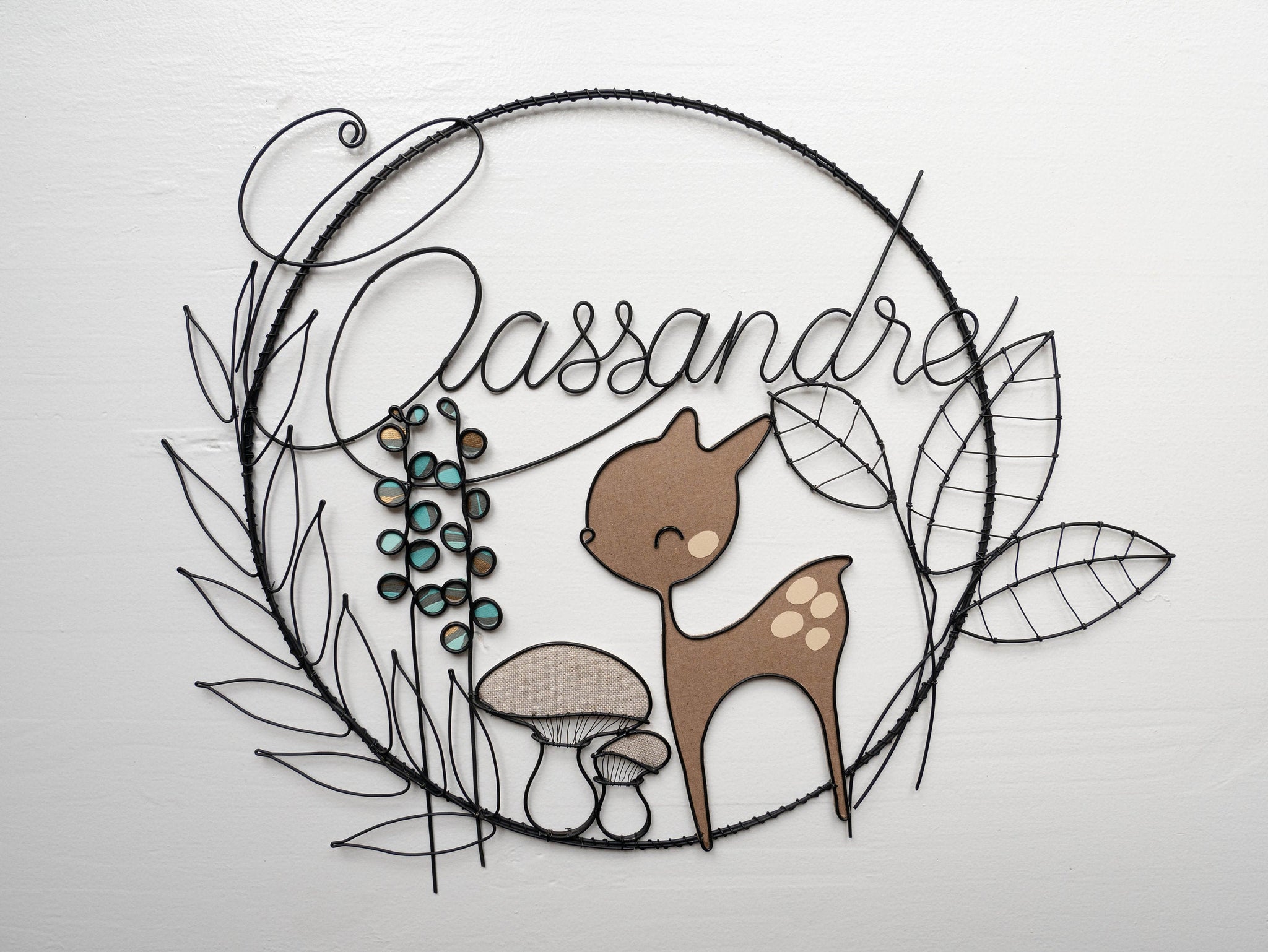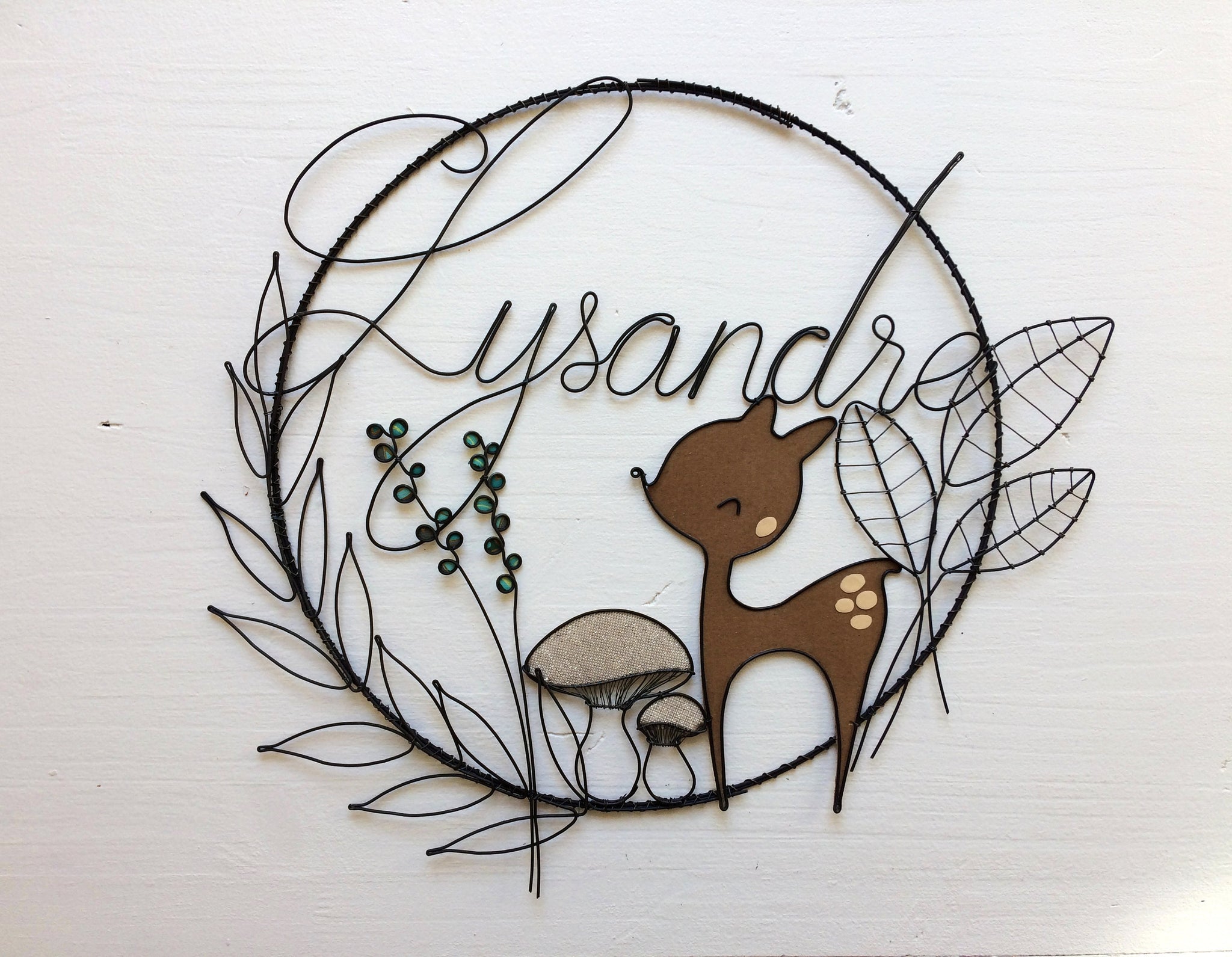 Prénom fil de fer, prénom personnalisable, fil de fer recuit, faon, champignon, automne, cadeau naissance bébé, cadeau baptême, plaque porte