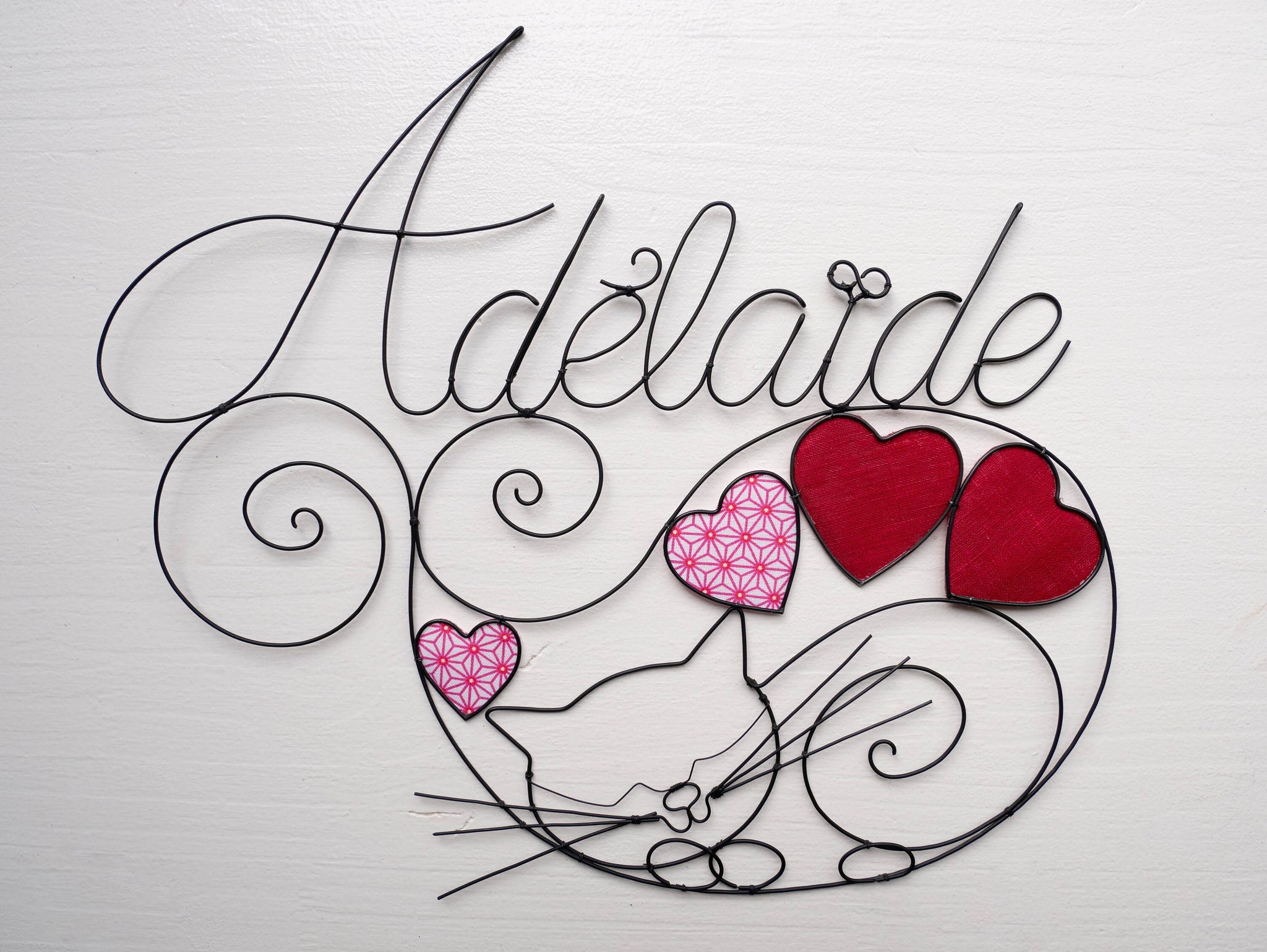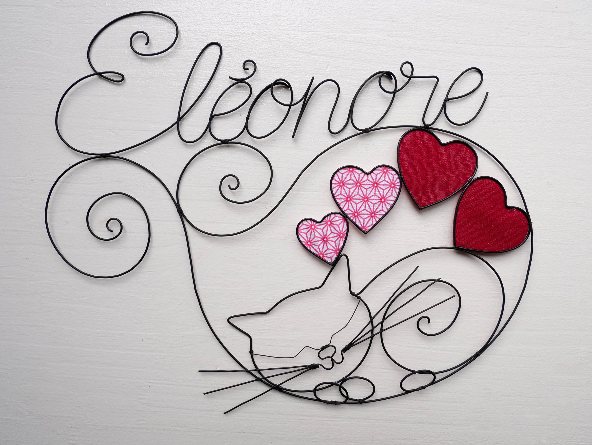 Prénom fil de fer, prénom personnalisable, chat fil de fer recuit, décoration chambre d'enfant, plaque de porte, prénom fil de fer recuit