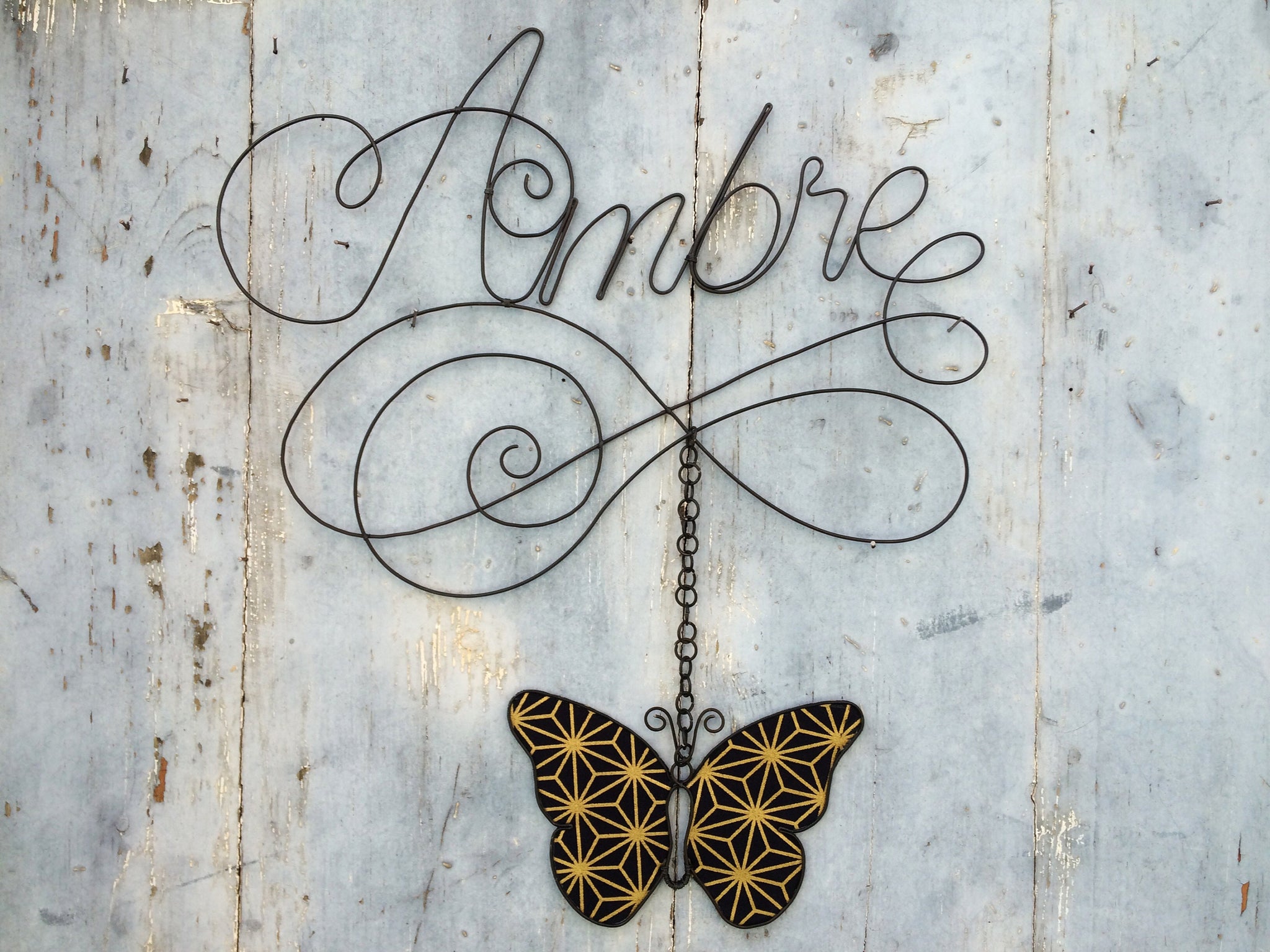 Prénom fil de fer, prénom personnalisable, cadeau de naissance, papillon fil de fer recuit, plaque de porte, décoration chambre enfant