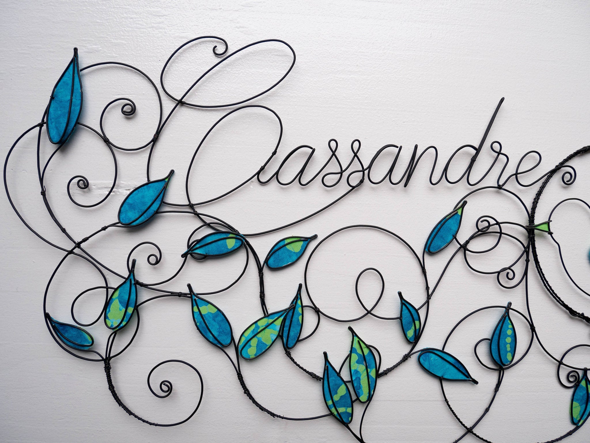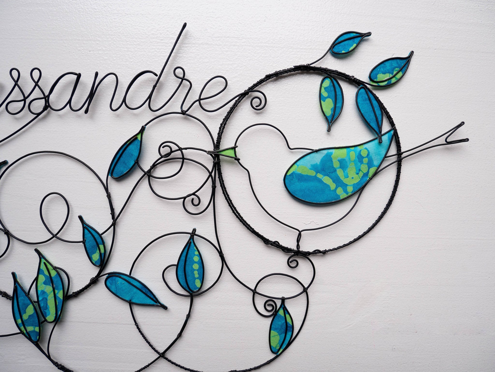 Décoration d'intérieur avec prénom en fil de fer recuit, décoration murale, esprit nature, plaque de porte, idée cadeau, oiseau, feuilles