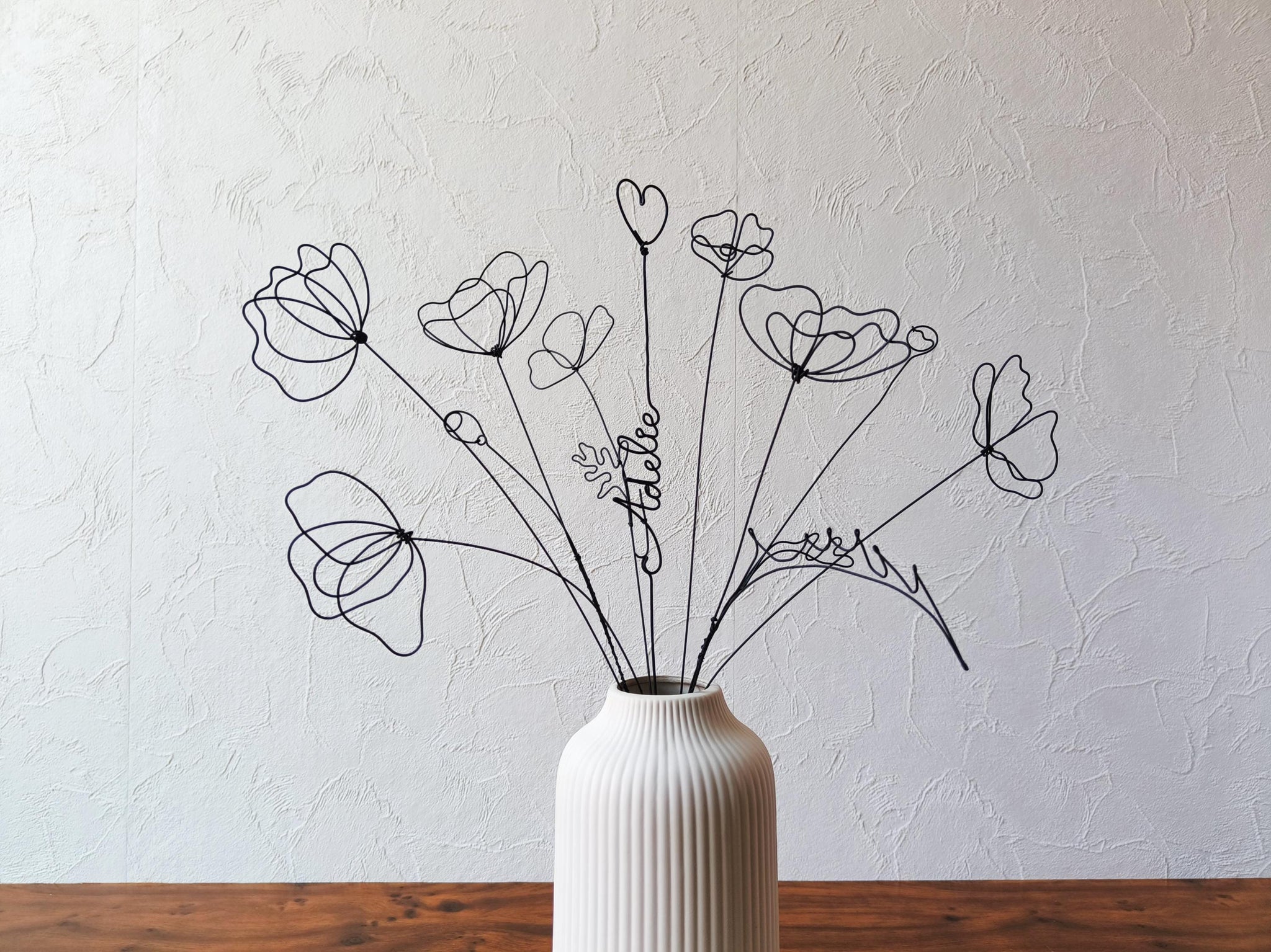 Fleurs en véritable fil de fer, bouquet de 9 fleurs personnalisées, déco de table fil de fer, prénoms personnalisés, coquelicot, cadeau